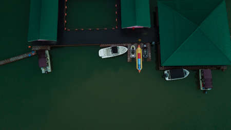 Aerial view photo of small motor boat or yacht standing near the wooden pier