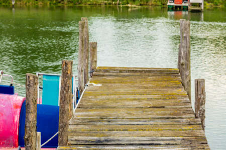 pier made of old rough wooden planks encrusted by salt with a moored old pedal boat
