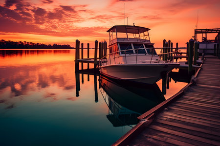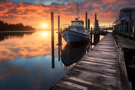 Beautiful sunset at the pier on the lake with a boat