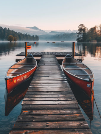 The first light of dawn illuminates a pair of canoes on a tranquil lake, mirroring the beauty of a serene morning on a wooden pier