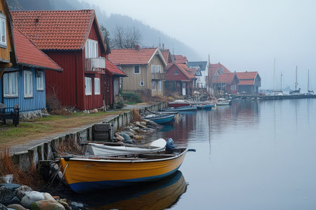 Several colorful rowboats are floating peacefully near a row of charming wooden houses in a Scandinavian fishing village on a foggy day