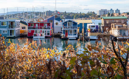 Floating Home Village colorful Houseboats Water Taxi Fisherman's Wharf Reflection Inner Harbor, Victoria British Columbia Canada Pacific Northwest. Area has floating homes, piers, restaurants.
