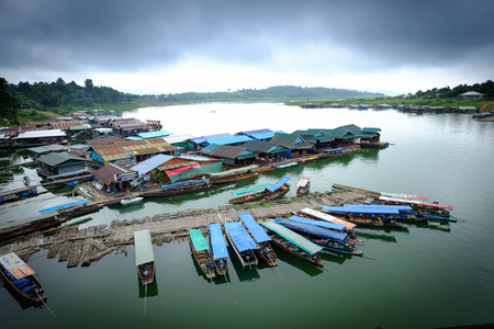 Sangkhlaburi - March 05, 2017: The scenery of floating village and a part of temporary bamboo bridge the river in Sangkhlaburi District, Thailand, in the early morning.