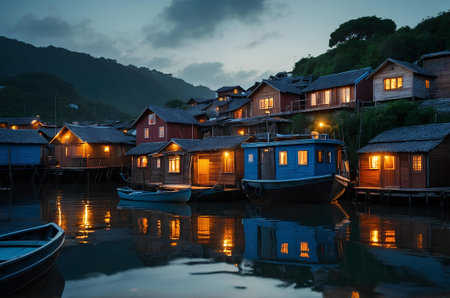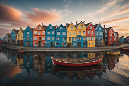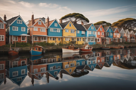 A serene coastal scene featuring colorful houses and boats reflected on calm waters during sunset, evoking a peaceful and vibrant atmosphere.