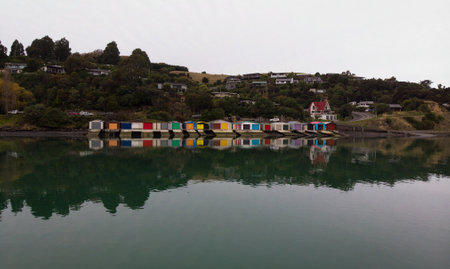 Historic old colorful boat sheds colored wooden houses on Duvauchelle Bay shore in Akaroa Harbour Banks Peninsula Canterbury South Island New Zealand