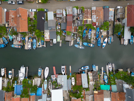 Fishing boats in a fishing village reflecting on the water. Life of a fishing village in shore of Songkhla, Thailand from drone bird eye view.