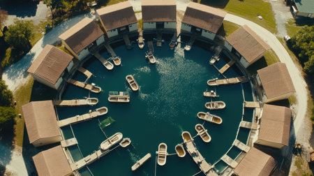 An aerial view showcasing a circular housing development with boats resting on a tranquil waterbody, surrounded by lush greenery, presenting a serene community atmosphere.