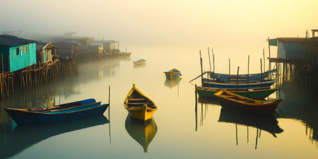 A serene fishing village at dawn, with colorful boats anchored near wooden piers, mist rising from the water, and soft light illuminating the scene. The tranquil setting captures simplicity and charm.