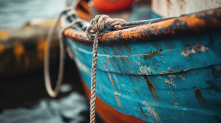 Old blue wooden shabby fishing boat detail. Shot with a selective focus