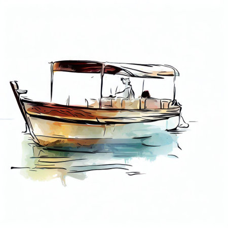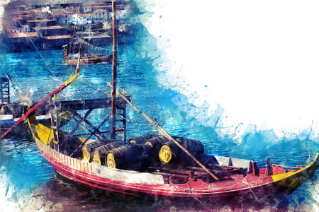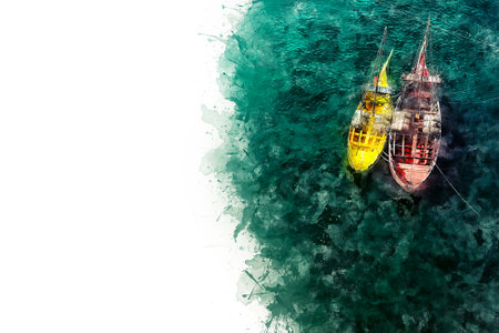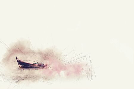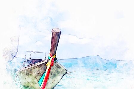 Abstract colorful fishing boat on water sea in Thailand on watercolor illustration painting background.