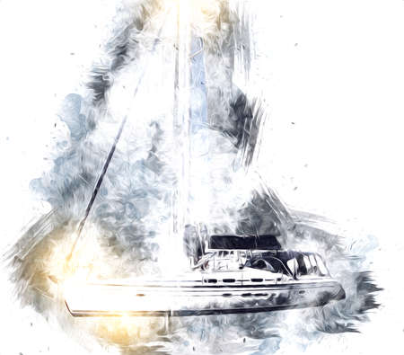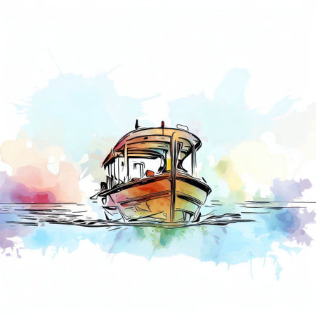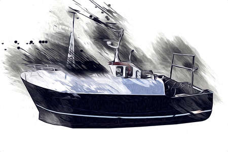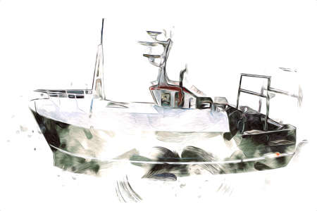 Abstract fishing boat in the sea on watercolor painting background.