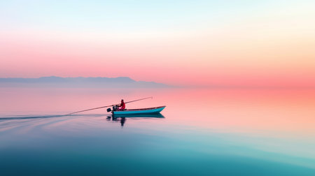 Pink sunset on the lake with an old boat. Blurred natural background, Sunset sky over lake. Silhouette nature baner
