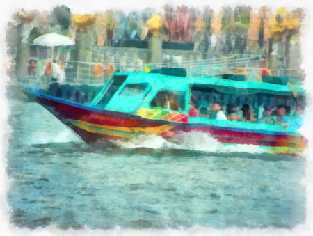 River ferry on the Chao Phraya River Bangkok watercolor style illustration impressionist painting.