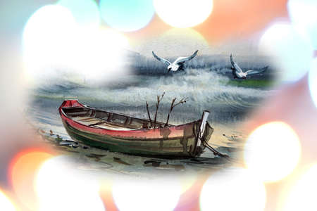 watercolor painted sea fishing boats flying birds on the background bokeh