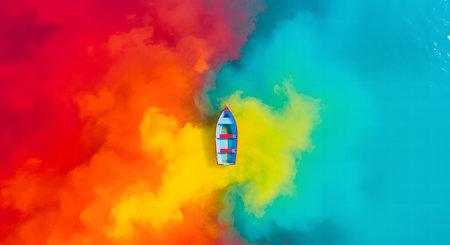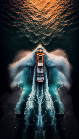 A boat moves gracefully over the water, leaving vibrant trails under a stunning sunset sky.