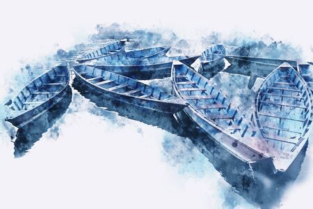Group of boats in lake watercolor painting, digital illustration