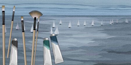 Several paintbrushes and paint tubes on nature landscape panoramic illustration