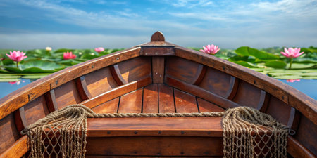 A beautifully crafted wooden boat navigates calm waters filled with blooming lotus flowers. The sky above is clear, showcasing a peaceful atmosphere that invites relaxation.
