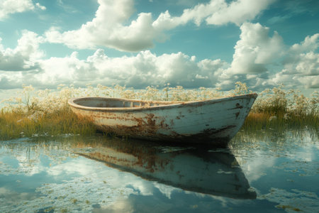 An abandoned boat sits peacefully in tranquil waters reflecting the cloudy sky and surrounding flowers.