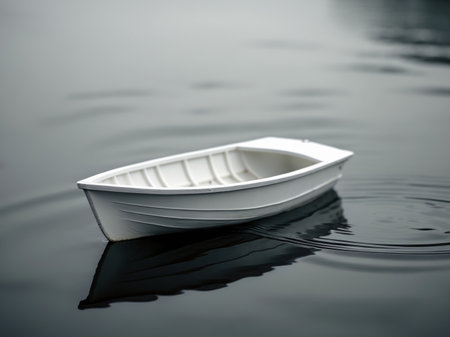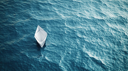 Minimalist top view of a paper sailboat on the ocean surface, surrounded by endless water with copy space.