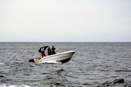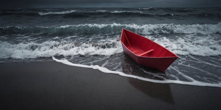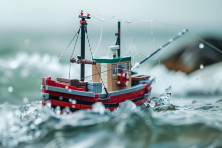 Red toy fishing boat with fishing nets sailing on rough sea waves