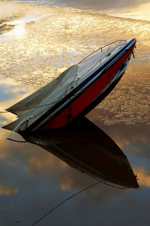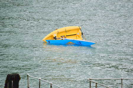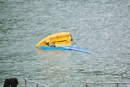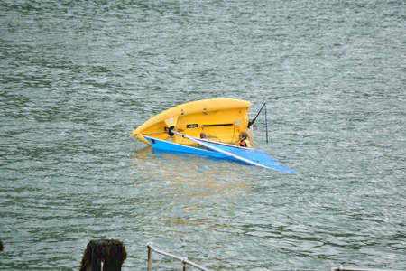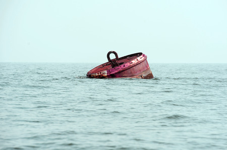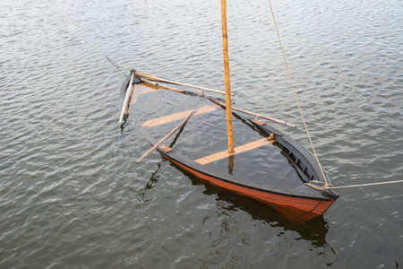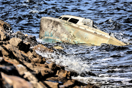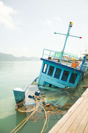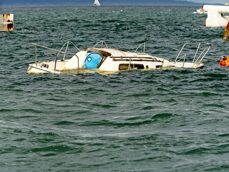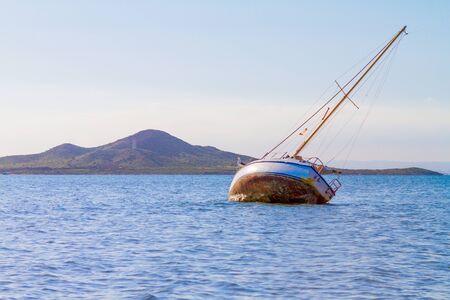 Sunken boat in the coastal waters, waiting for the towing to the shore