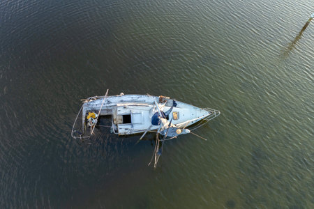 Aerial view of sunken sailboat on shallow bay waters after hurricane in Manasota, Florida