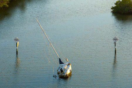 Half sunken sailing yacht capsized on shallow bay waters after hurricane Ian in Manasota, Florida