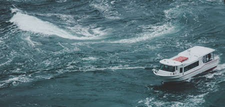 A photo of a storm-tossed boat struggling against heavy waves and strong winds at sea, illustrating the challenges and dangers of maritime storms.