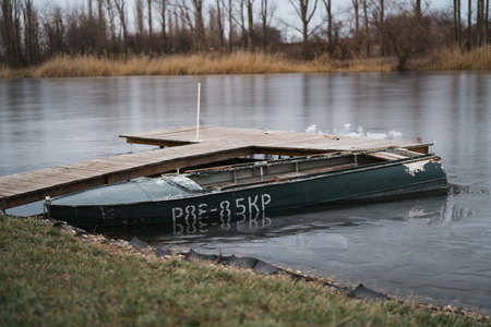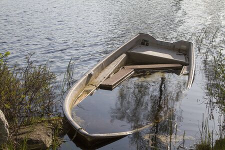 Shipwreck - old forgotten wooden boat on a Norwegian lake was full of water