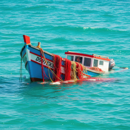 A vibrant fishing vessel bobs precariously in turquoise waters. Red netting hangs from its side, caught in the undulating swells of the sea.