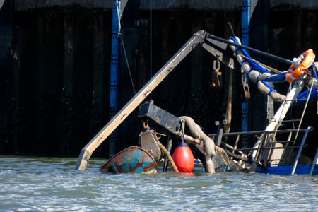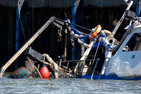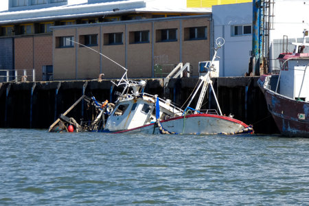 Fishing vessel partially submerged in a harbor, depicting a maritime accident scene with potential environmental and economic consequences
