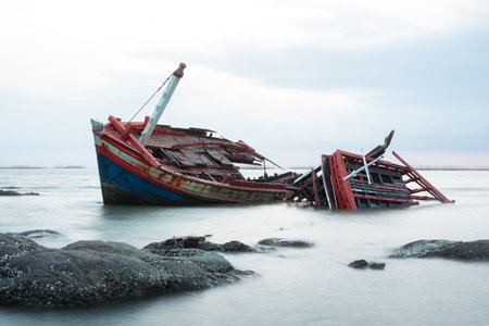 Old wrecked fishing boat at shore of Ang Sila Village, Saensuk Sub-district, Chonburi Province of thailand with sunset skyline suite for concept of natural disaster, storm surge.