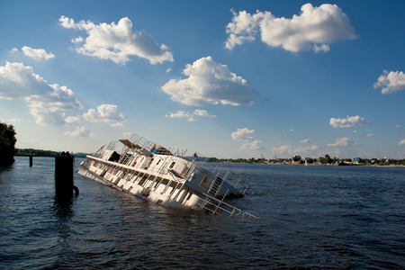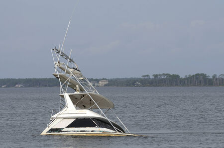 A large cabin cruizer fishing boat sits halfway underwater in sunk in Saint Andrew Bay a result of a storm near Panama City