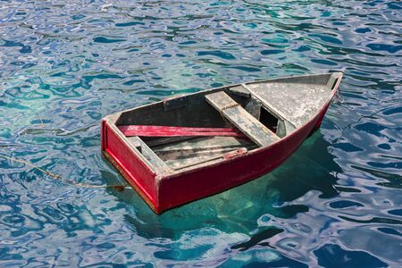 Old abandoned and sunken wooden fishing boat in the port of Sciacca, fishing village in Sicily, Italy