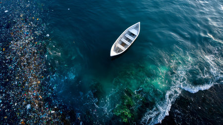 This striking image portrays a small boat amidst swirling pollution and debris in murky water, highlighting the urgent environmental issues we face today.