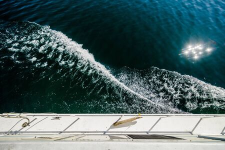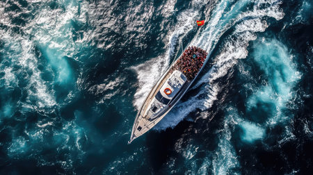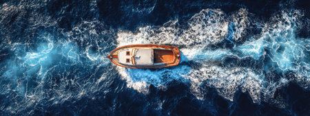 An overhead perspective reveals a white boat cutting through dark water, creating foamy wakes. The composition highlights the vessel's movement, with the sun casting highlights on the water. Suitable for illustrating travel, leisure, or transportation concepts, this image offers potential for diverse commercial applications.