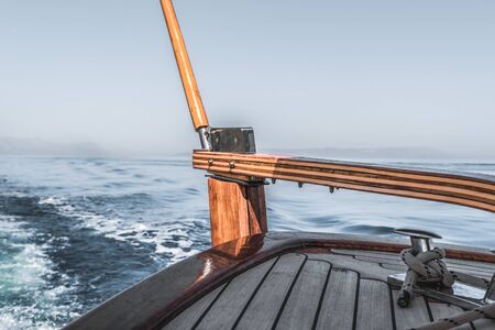 Wooden rudder on small wooden boat and blue sea, Croatia