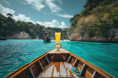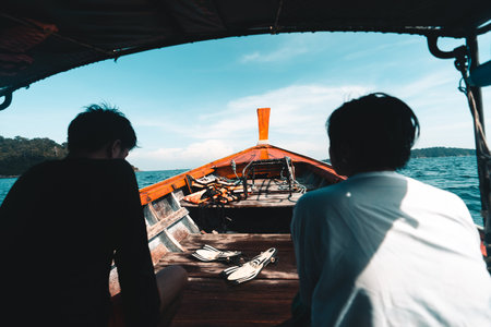 On thea long tail boat travel to the islands, clear skies and sea.