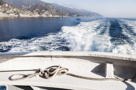 View from a high-speed ship on the blue sea with a mountainous coast in the background
