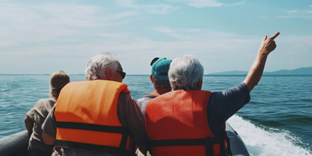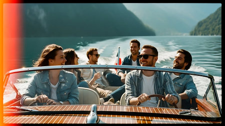 Summer lake adventure, friends on a boat, relaxing and taking in scenic landscapes.