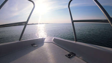 Seascape, view of sea waves with sun reflection from prow of motorboat. Boat jumping on waves on sunny summer day. Yacht motor boat sailing fast at sea horizon. Extreme sport entertainment background