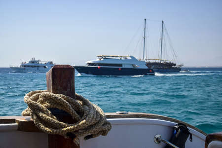 Rope is wound on mooring post of yacht. View on background of blue sea and yachts. copyspace. close-up. selective focus.