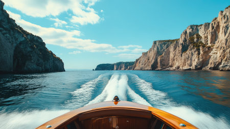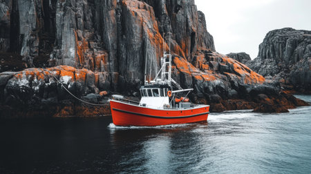 A vivid orange fishing boat glides through tranquil waters, surrounded by rugged cliffs. This stunning scene captures the essence of marine adventure and natural beauty.