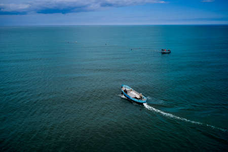 Aerial view of motor boat sailing in the sea. Amazing seascape with the fishing boat.