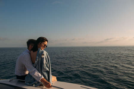 Attractive caucasian couple meeting sunset on a motor boat enjoying marine trip along sea coast. Perfect celebration of a honeymoon with great beautiful seascapes with copyspace for message