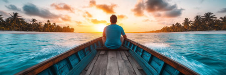 Man Contemplating Tropical Sunset From a Wooden Boat, a Serene Moment of Freedom and Adventure