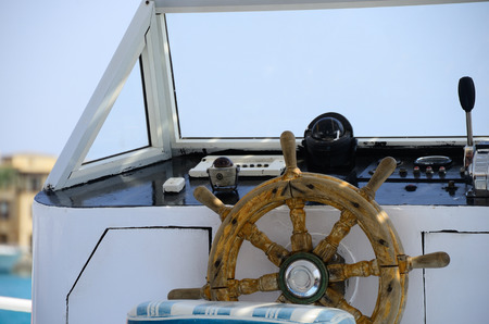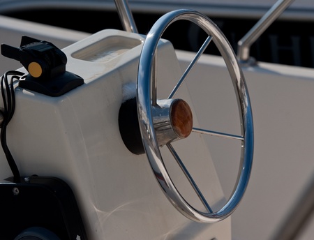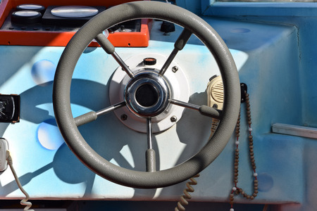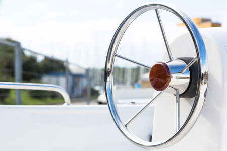 Steering wheel of a sea boat in a sunny day