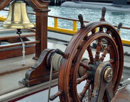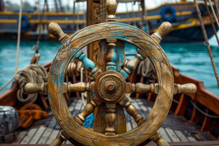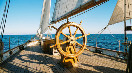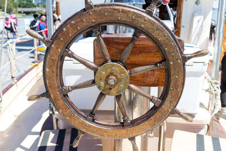 Old wooden ship wheel controlling the rudder and steering a vintage sailboat on the sea