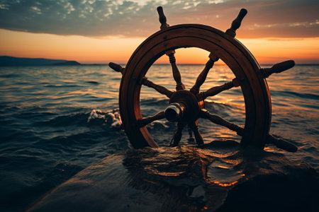 Vintage wooden ship wheel at sunset on calm ocean. That the image is generated using AI.